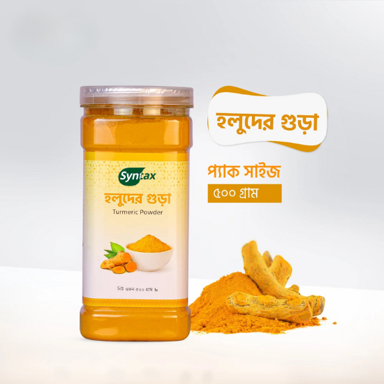 Syntax Turmeric (Holud) Powder 500g is a premium-quality spice made from carefully selected turmeric rhizomes. These rhizomes are cleaned, dried, and finely ground to retain their bright golden color and naturally rich aroma. Turmeric has been a traditional ingredient in our kitchens for centuries, known not only for enhancing the taste of food but also for its natural beneficial properties.